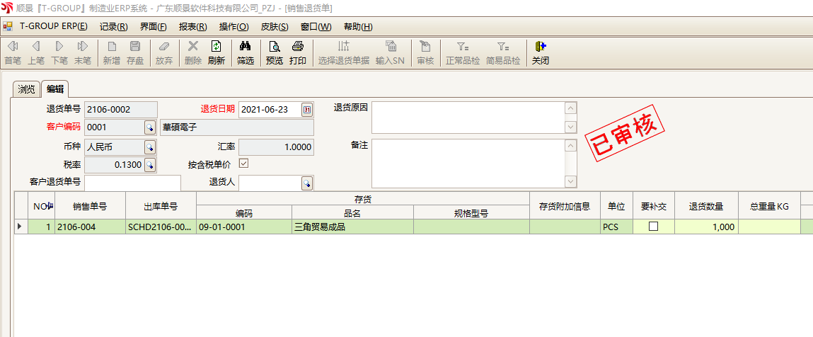 15.若出货商品,客户退回后,A公司库内做了销售退货单。